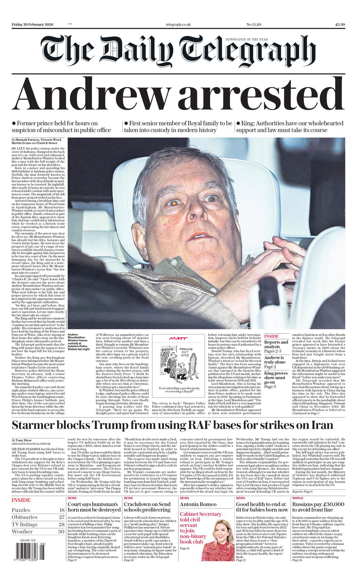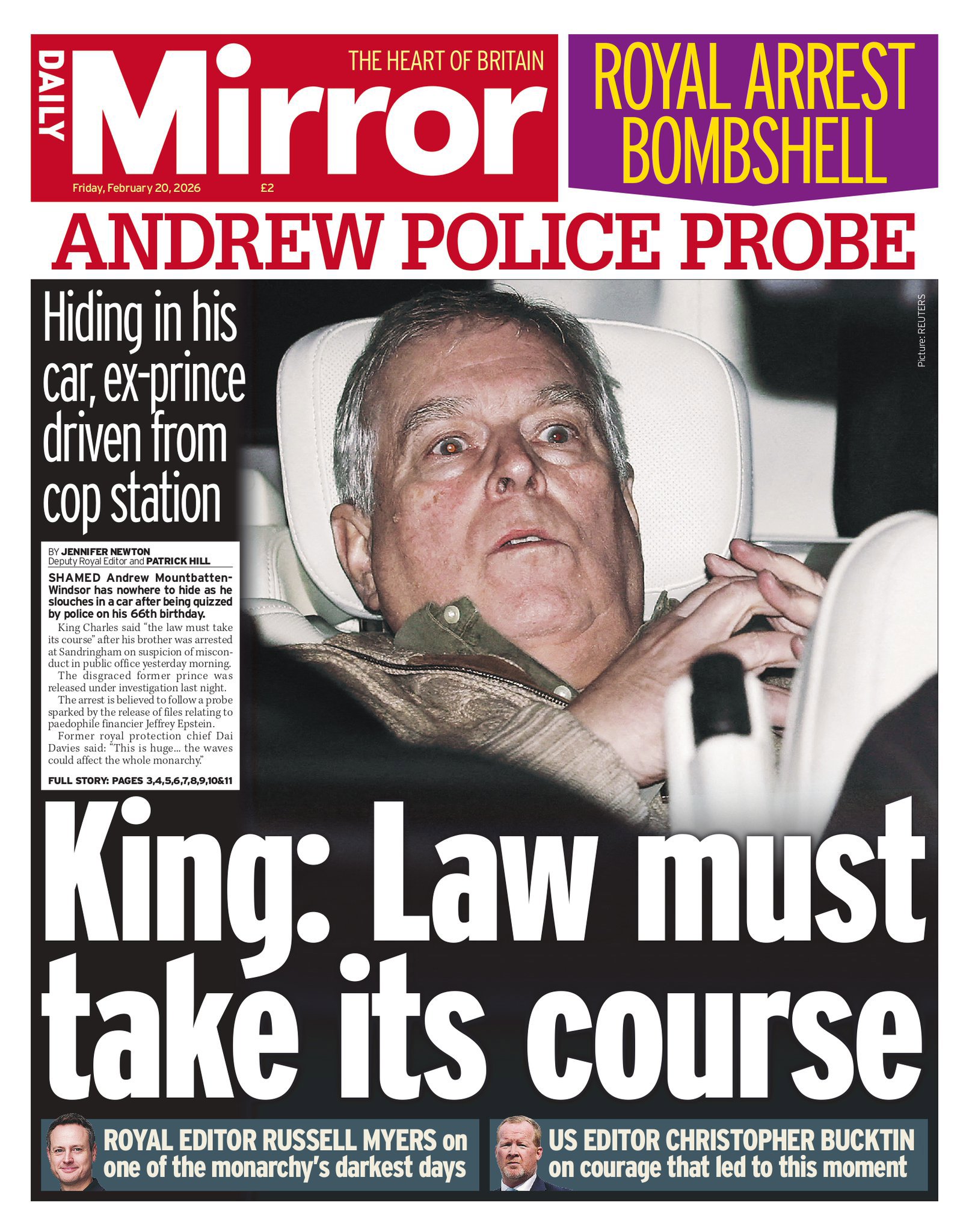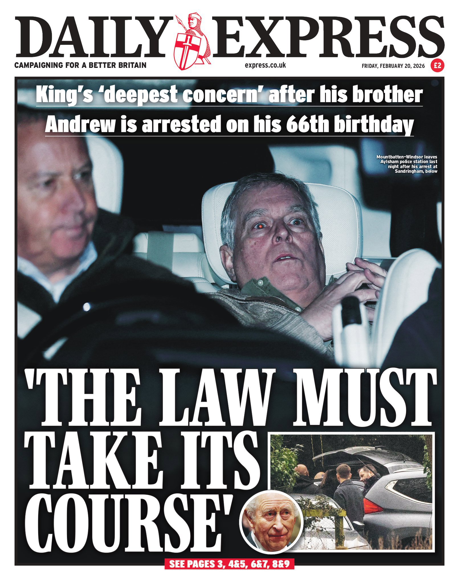 All the UK newspaper front pages the day after ex-prince's arrest