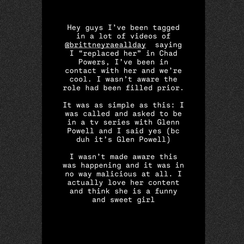"It was as simple as this: I was called and asked to be in a tv series with Glenn [sic] Powell and I said yes (bc duh it’s Glen Powell)," she added. "I wasn't made aware this was happening and it was in no way malicious at all. I actually love her content and think she is a funny and sweet girl."
